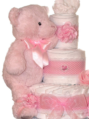 Our So Sweet Girl 4 tier diaper cake is a sweet and elegant gift to celebrate the birth of a new baby girl